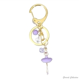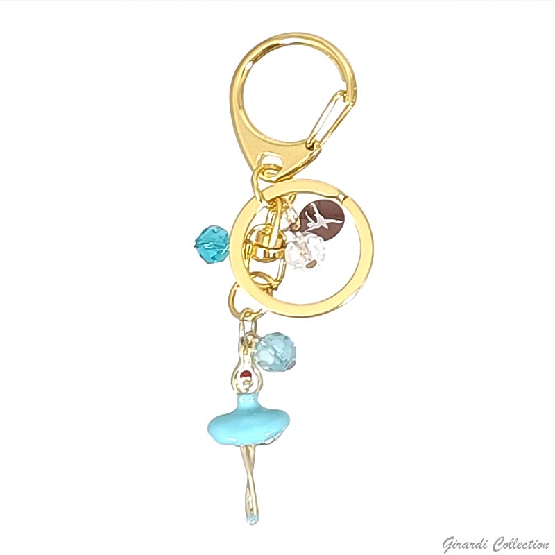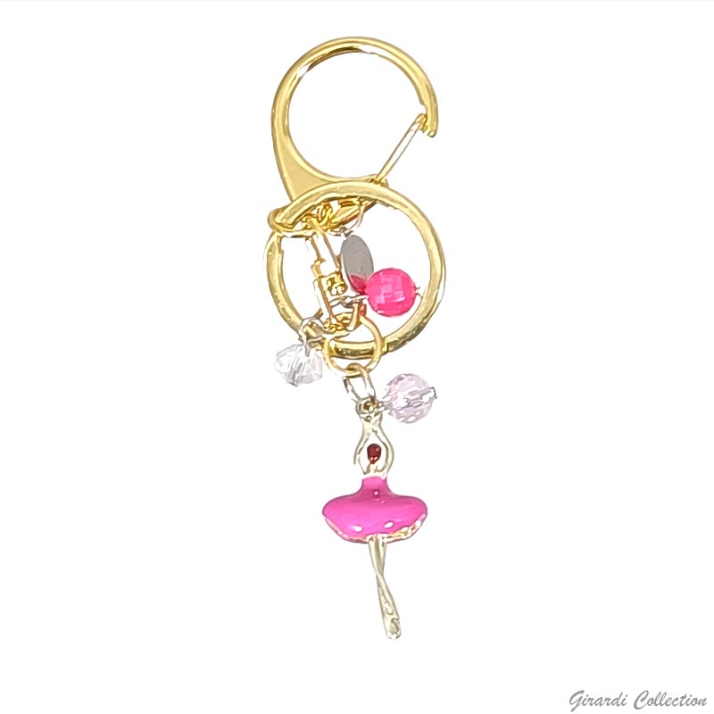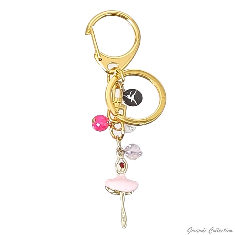 Gold-colored metal keyring with enameled ballerina pendant and colored beads.Length 10 cm
